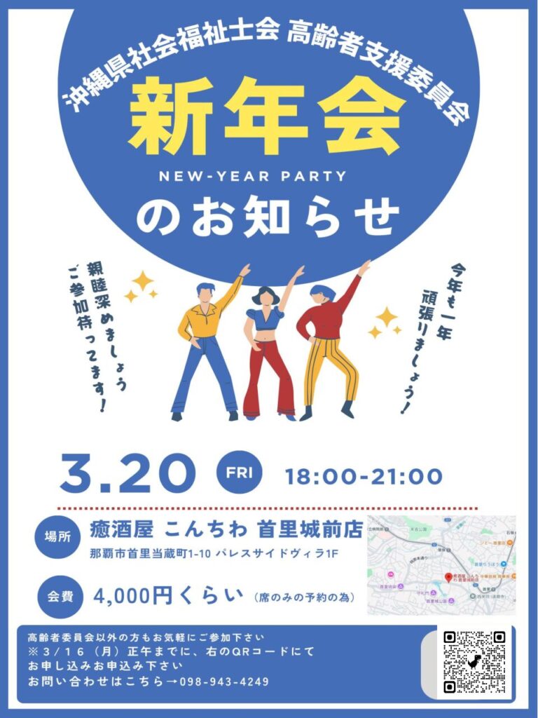 高齢者委員会 新年会 を今年も開催します! 親睦を深めて、今年も一年頑張りましょう! 日時:2026/3/20(金)18:00-21:00場所:癒酒屋 こんちわ 首里城前店 那覇市首里当蔵町1-10 パレスサイドヴィラ1F会費:4000円くらい(席のみの予約の為) 高齢者委員会以外の方もお気軽にご参加下さい ※3/16(月)正午までにチラシ記載のQRコードにてお申込み下さい お問い合わせはこちら→098-943-4249 「支援者のための成年後見活用講座」申込受付中です 前の記事 2026年度 合格者歓迎会(新規加入者説明会)及び入会説明会のご案内 次の記事